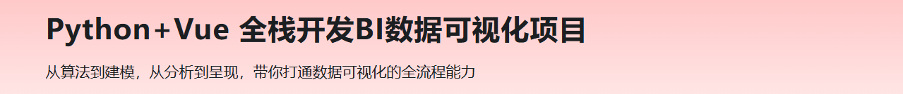 Python+Vue 全栈开发BI数据可视化项目视频教程。本课程结合当前BI可视化分析主流工具及框架(Pandas & Numpy & Flask & Vue & Mysql),手把手带你开发一个全栈项目,全流程特训你的数据可视化能力,助力你迅速成为数据时代的新锐开发者。