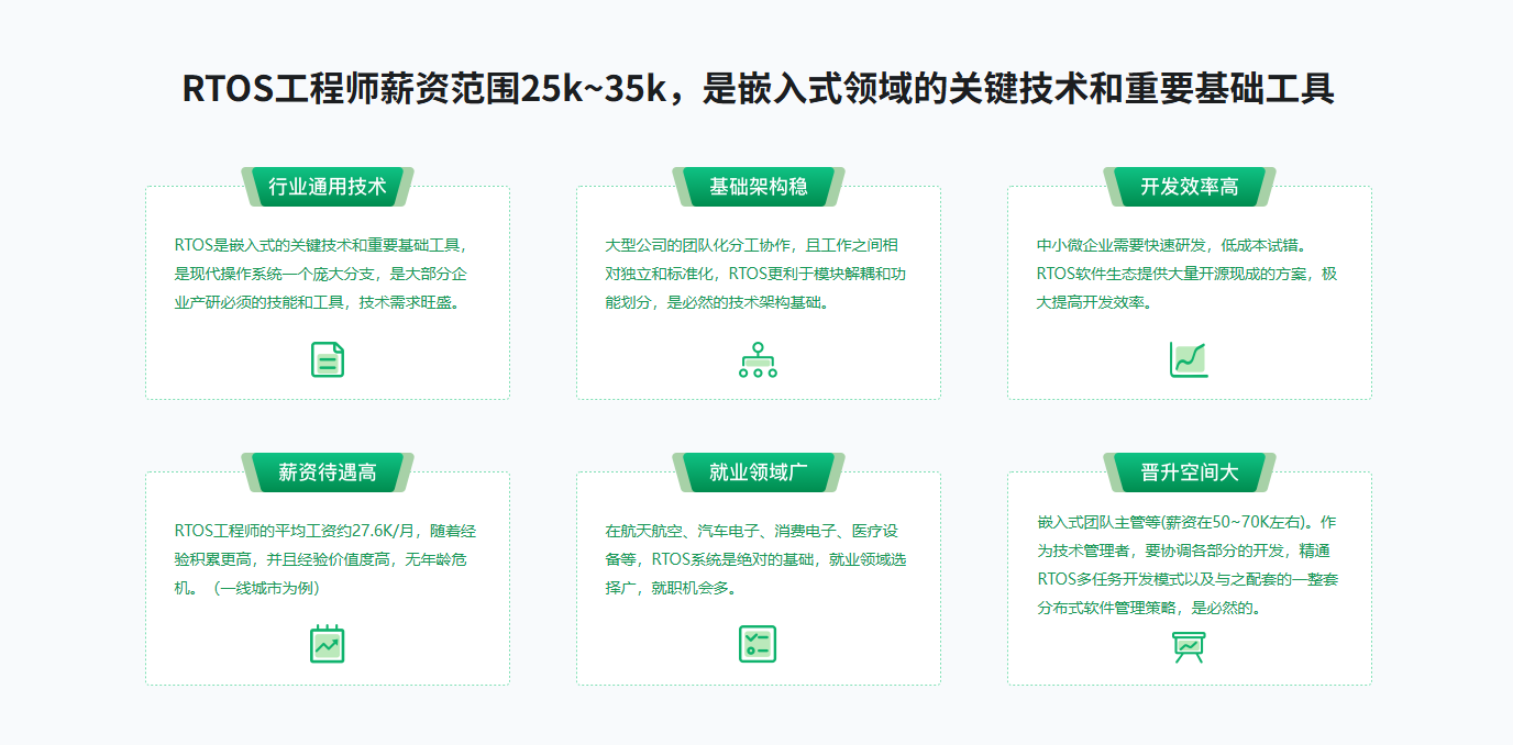 嵌入式RTOS工程师就业课(基于FreeRTOS) 视频教程,这门课程结合了老师超过14年的行业实战经验和数千名学员的教学反馈,特别针对初学者的痛点进行了重新设计。课程更加注重学习体验和实际操作安排,旨在帮助新手轻松入门,享受学习过程,并快速掌握实践技能,以达到中级工程师的水平。