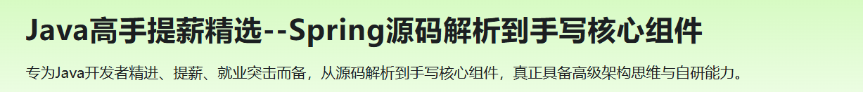 竞争激烈的职场中,掌握 Spring 源码能助你在求职时获得更好职位和薪资。Spring 源码可帮助你突破瓶颈,提升代码优化能力,从容应对工作挑战。拥有深厚的Spring 源码知识,能让你参与核心业务开发,对企业架构进行升级与优化等。课程聚焦 Spring 四大核心模块,实战导向设计,通过项目案例深度剖析源码,手写核心模块源码,深度解读经典面试题。全面提升你的技术实力,解决工作中的疑难问题。