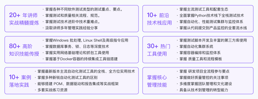 测试高级工程师系统养成-高薪就业课视频教程,这门课程特邀了资深测试总监,凭借其20年的实战经验,提炼出核心精髓。课程将帮助你从基础技能入手,逐步深入高阶技术,并提升团队管理能力。通过系统化的学习,你将实现高阶测试技能与管理水平的双螺旋提升,从容应对企业中的复杂问题,快速成长为领域内的核心测试专家。