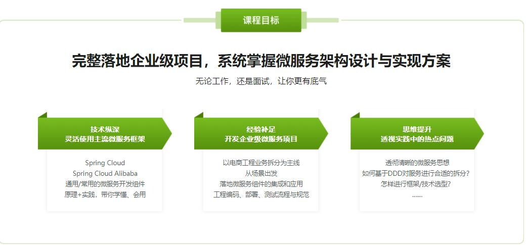 没有实战过微服务架构的人,不能说真懂微服务。因为除了技术的实现,这其中还涉及了难以量化的业务拆分和组件化思想。这门课就带大家以电商工程为例,基于Spring Cloud / SpringCloud Alibaba ,融合常用组件/中间件,进行微服务架构设计和开发,获取真正的企业级微服务解决方案。