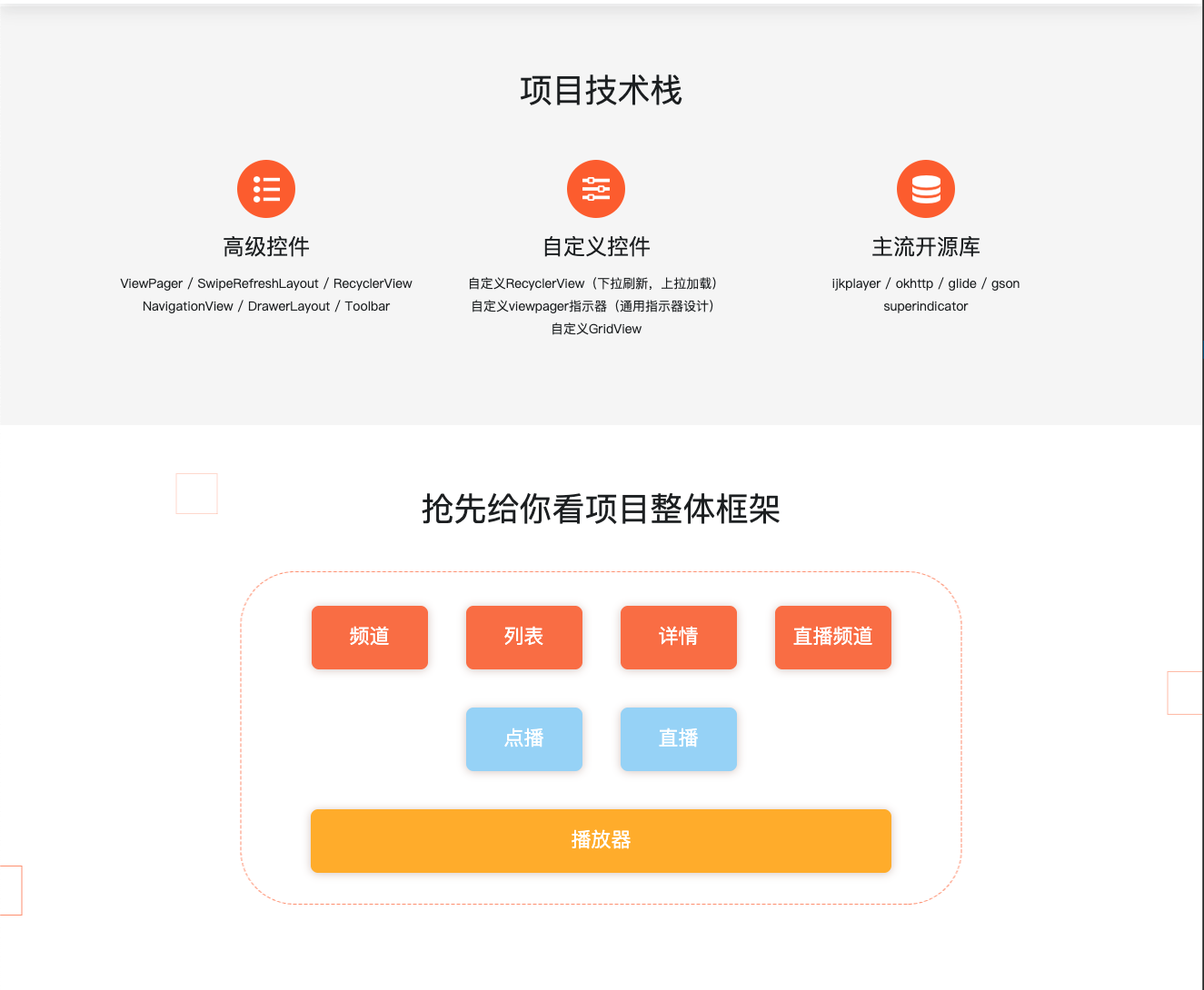 本章将带大家实现详情页模块,大家可以学习到:1.如何对复杂布局进行分析,2.详情页面请求数据测试及video接口逻辑,3.详情页面请求video接口验证,4.video数据如何通知到UI,5.详情页Video的适配器实现,6.如何自定义GridView ,7.多频道剧集测试,8.详情页点击播放按钮逻辑处理,9.sohu,Letv真实播放地址逻辑处理,补全…