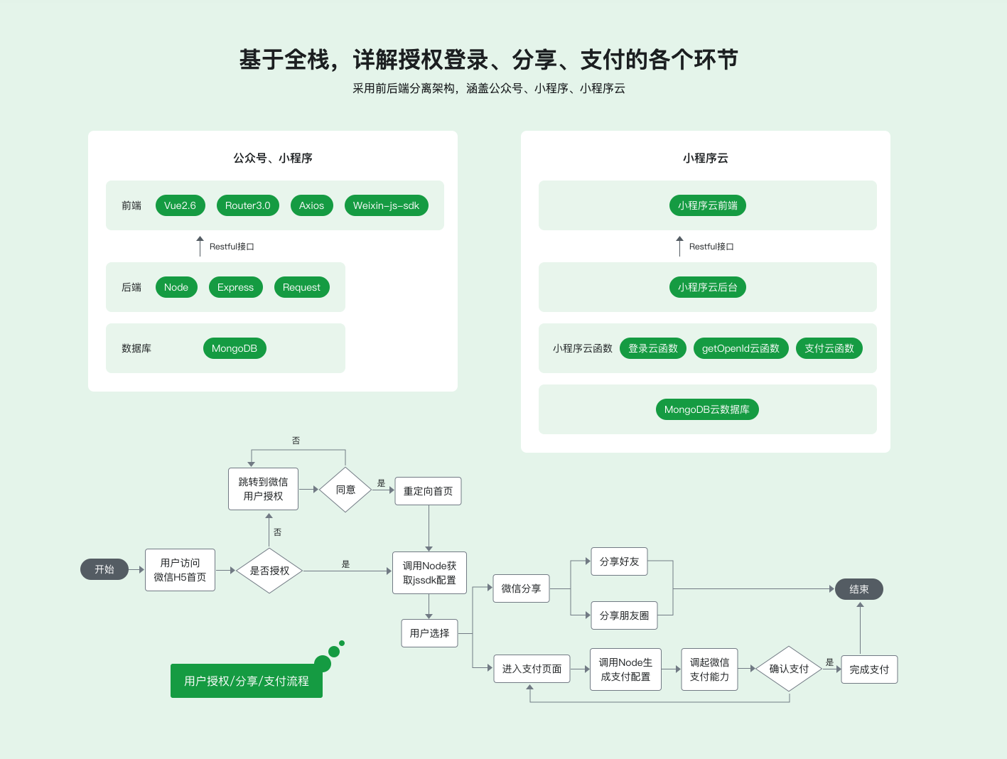 • 本章节讲解Express项目创建,Node配合前端做微信用户授权以及通过Node生成js-sdk签名信息。